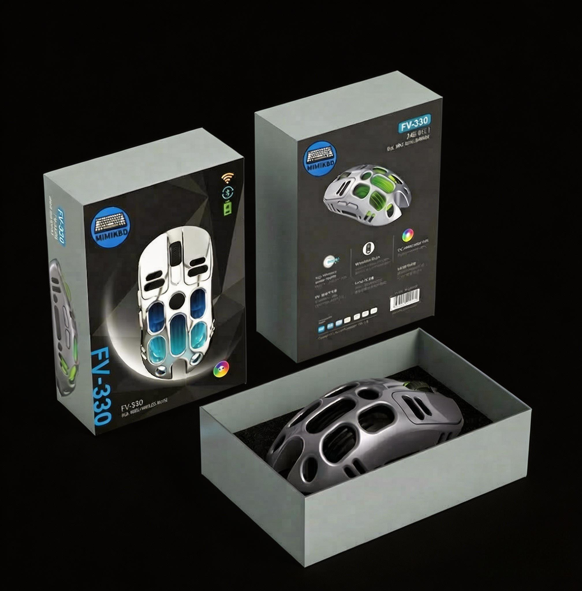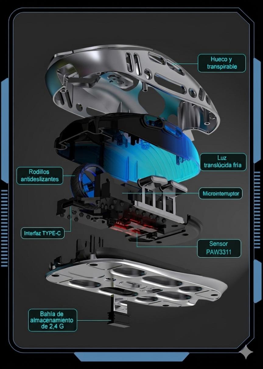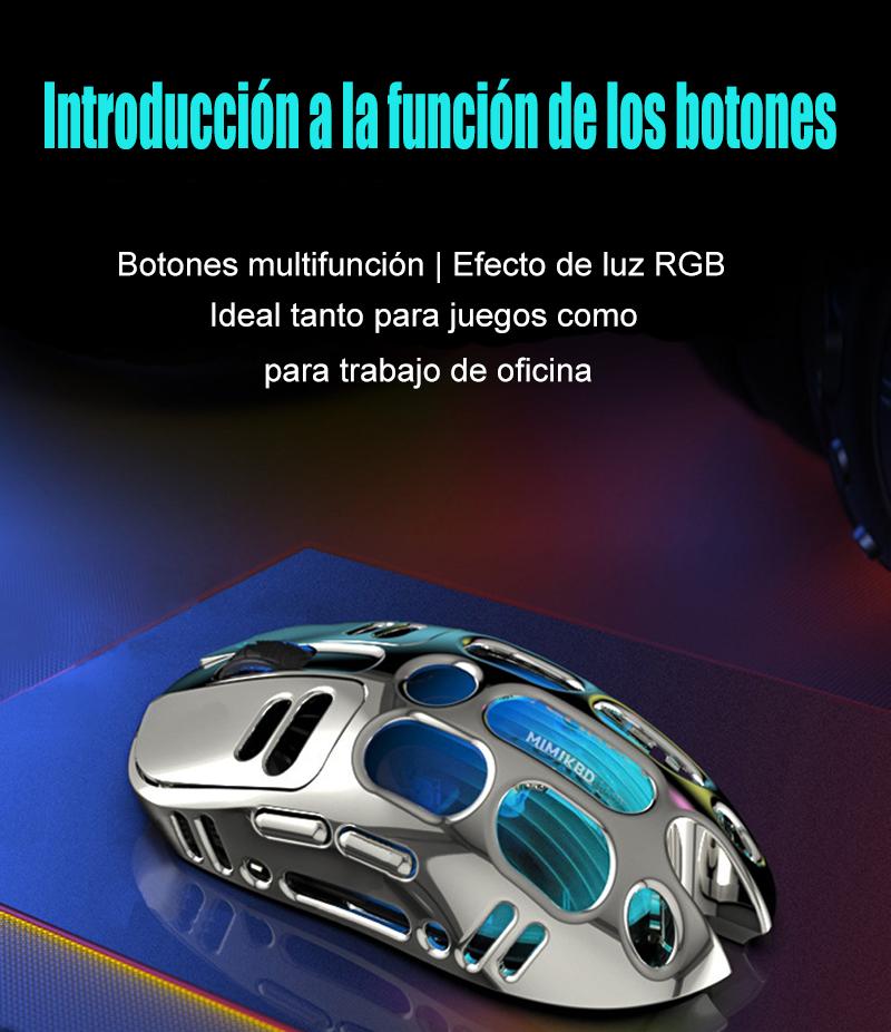 - Estilo Futurista: Su diseño hueco no solo le da un aspecto agresivo y moderno, sino que mejora la ventilación de la mano. El acabado de textura metálica y la iluminación RGB lo convierten en el centro de atención de tu escritorio.