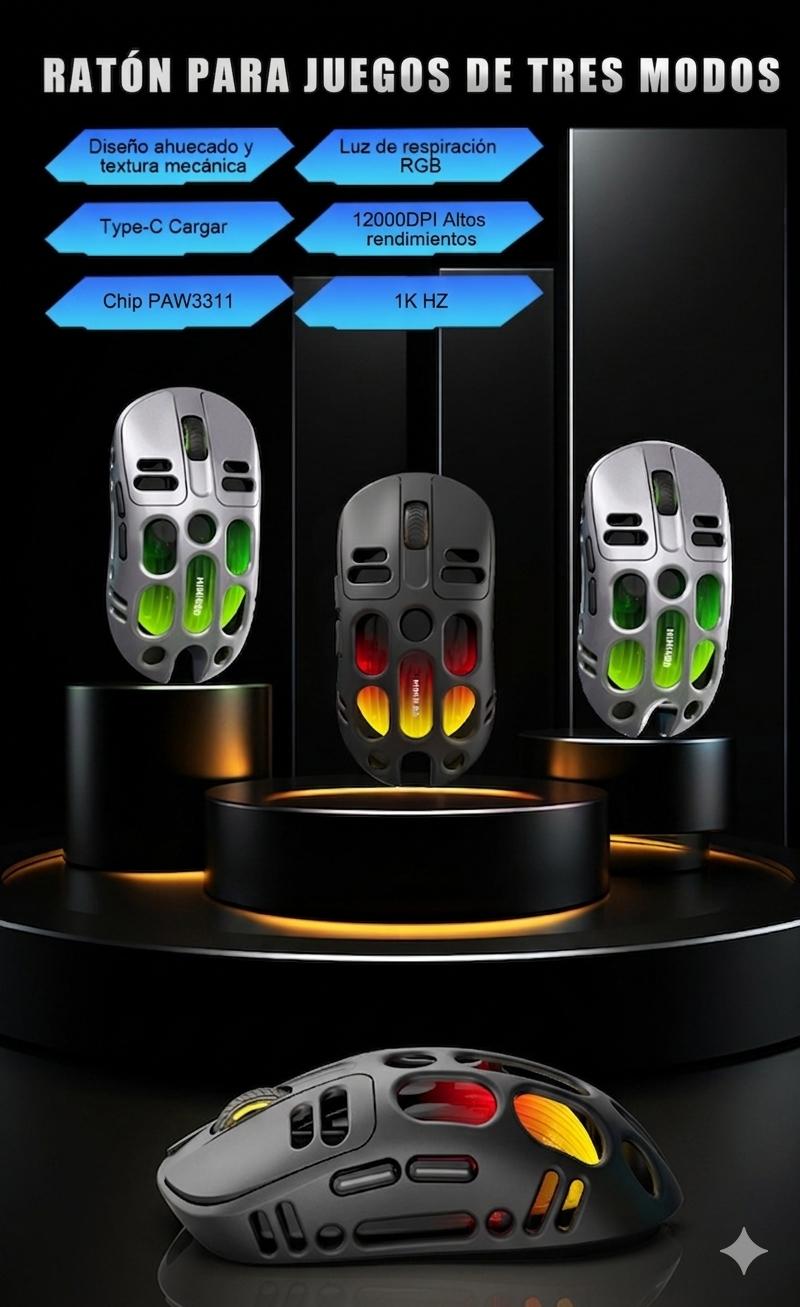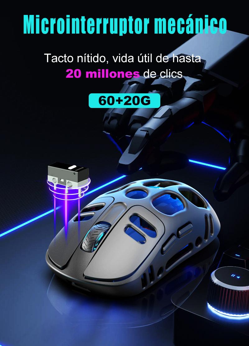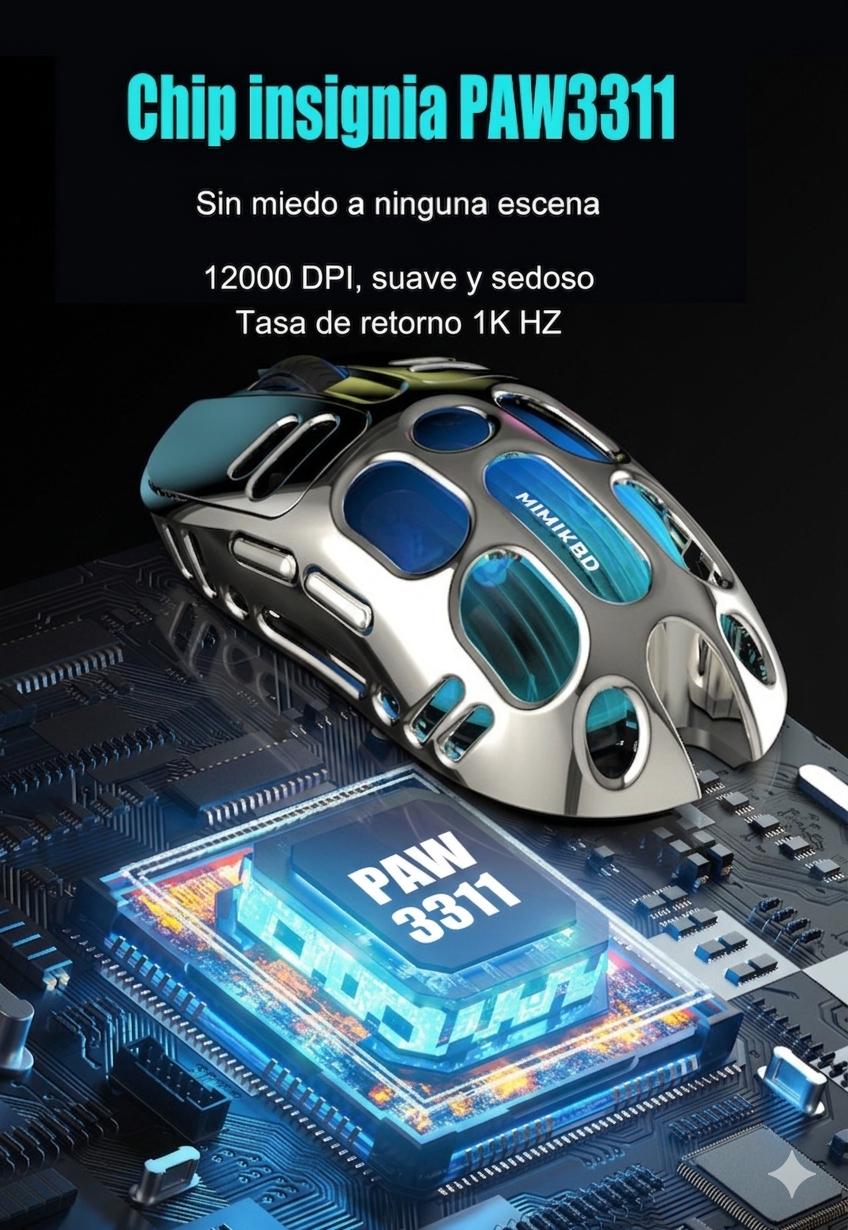 Este ratón inalámbrico utiliza el chip PAW3311 y admite conexión Bluetooth, 2.4G y por cable, iluminación RGB y una sensibilidad DPI máxima de 12000 ,Frecuencia de retorno máxima 1000 Hz,Su diseño ligero pesa tan solo 69g