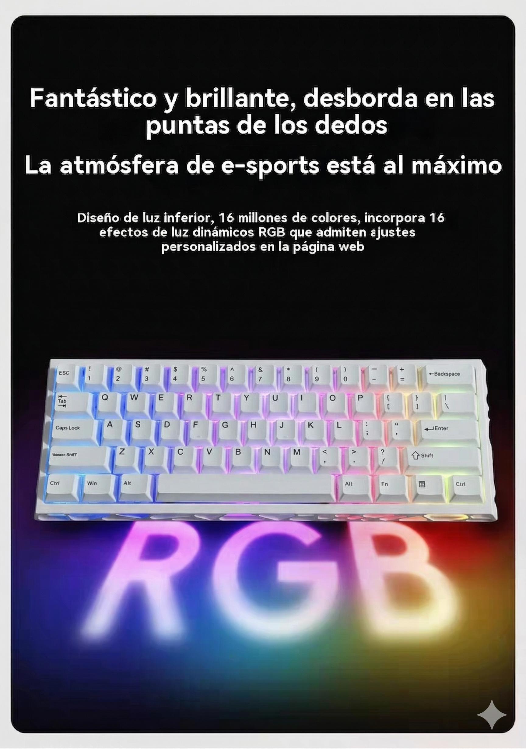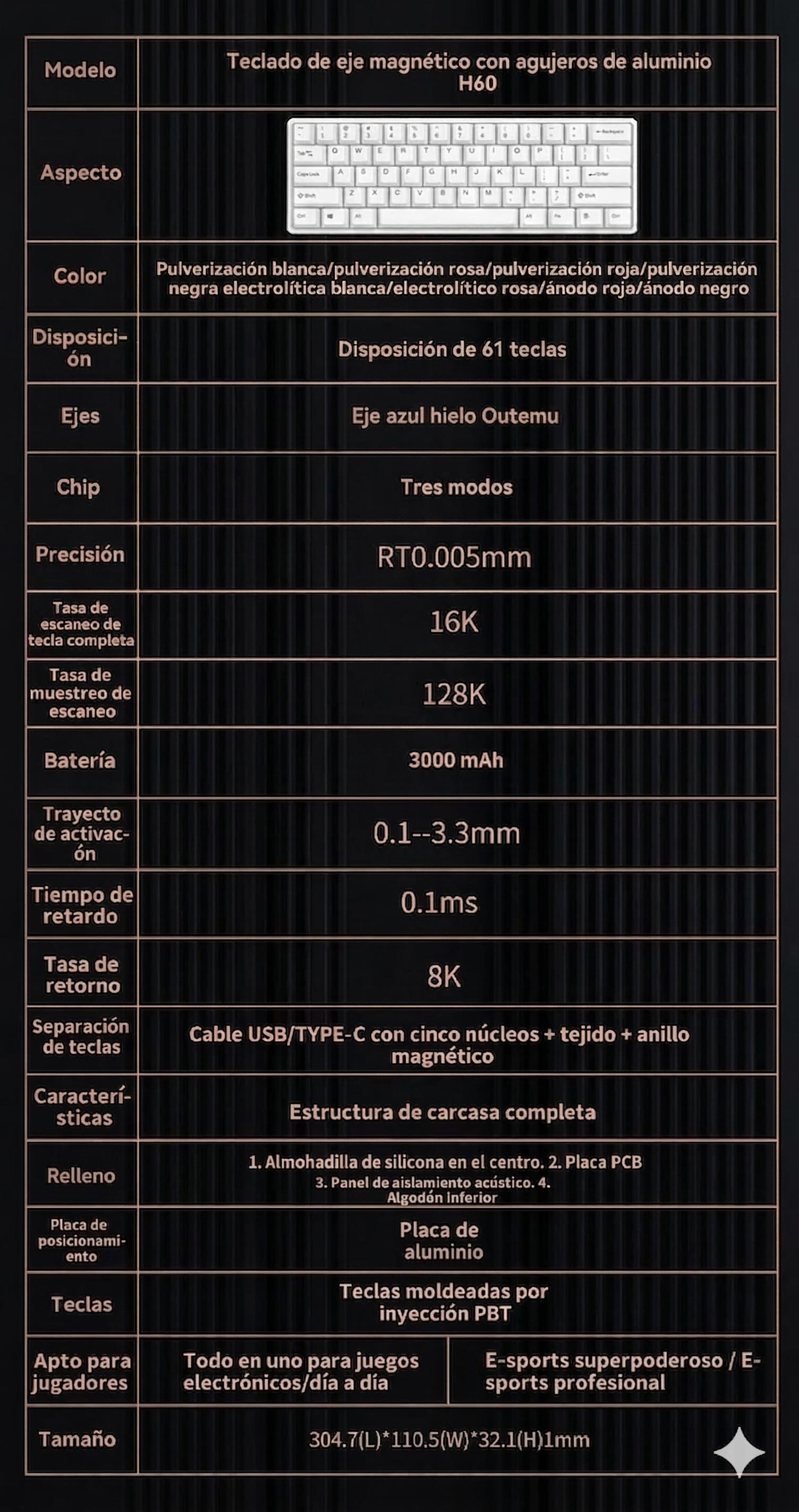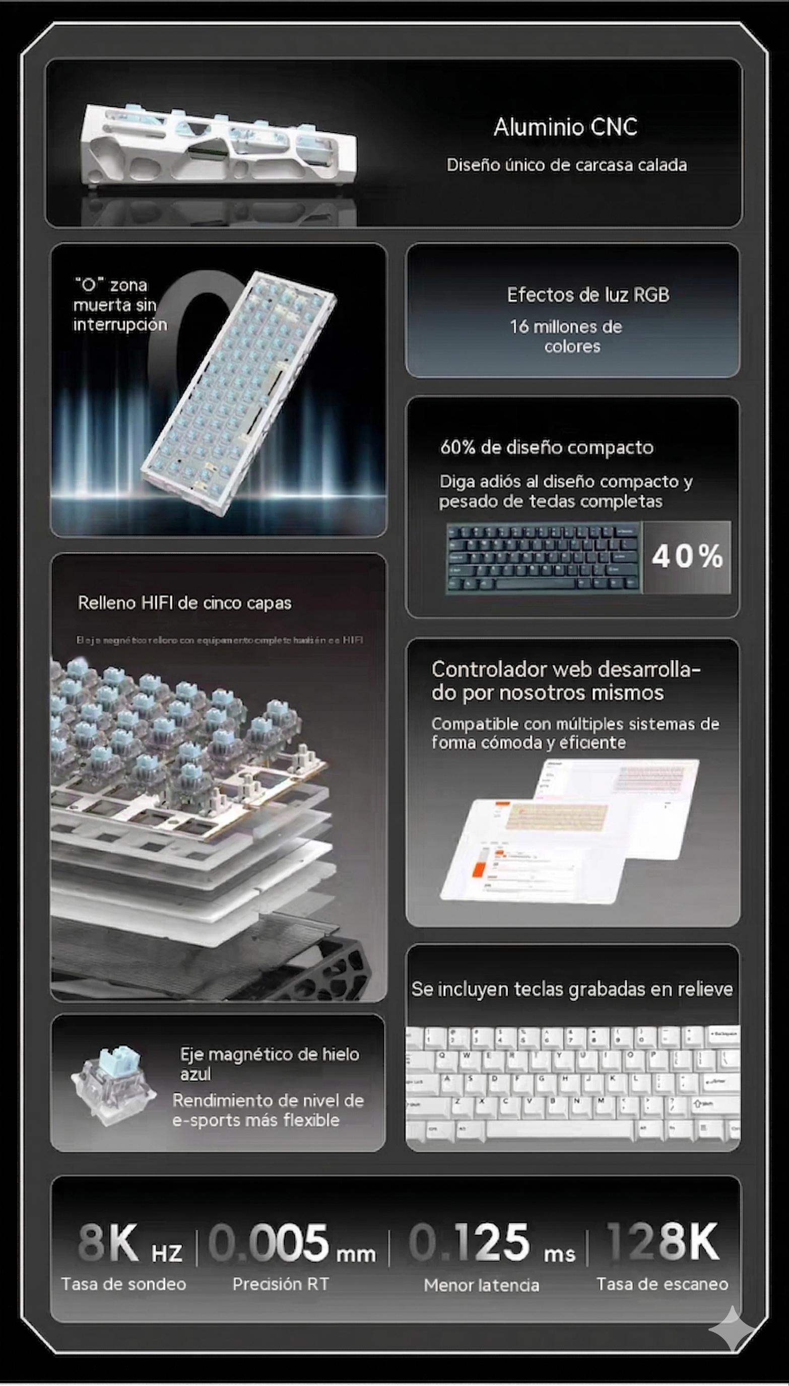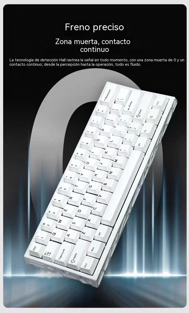 Teclado Magnético Mecánico 8k Rgb E-sport;Disposicion de 61 teclas;Eje azul hielo Outemu;Tasa de retorno 8K;Tasa de muestreo de escaneo 128K;Precision RT0.005mm;Tasa deescaneo detecla completa 16K;Tiempo de retardo 0.1ms;Tres modos-Bluetooth/2.4/Con cable