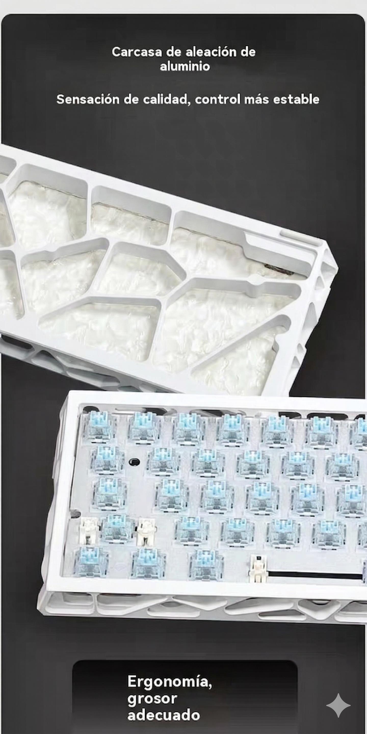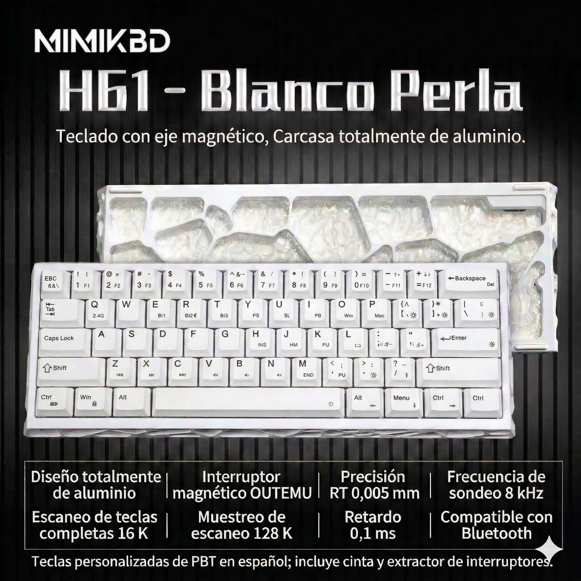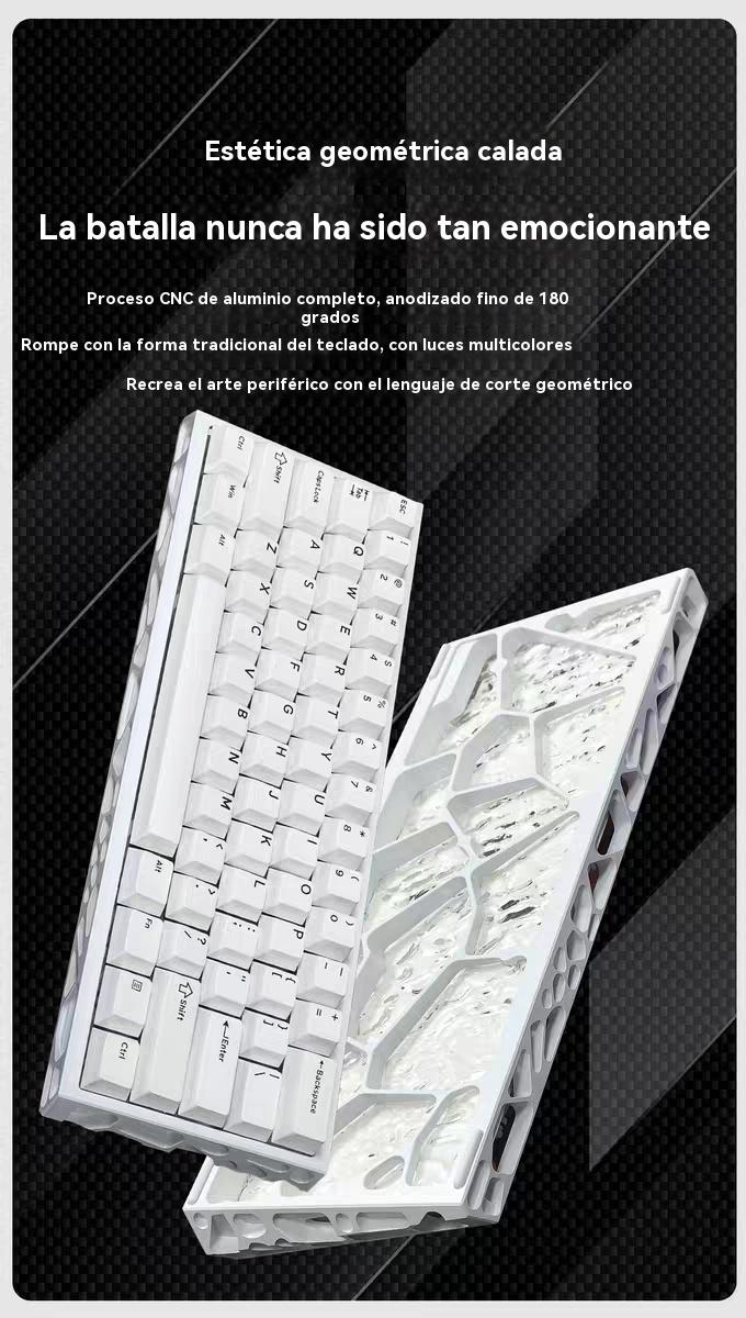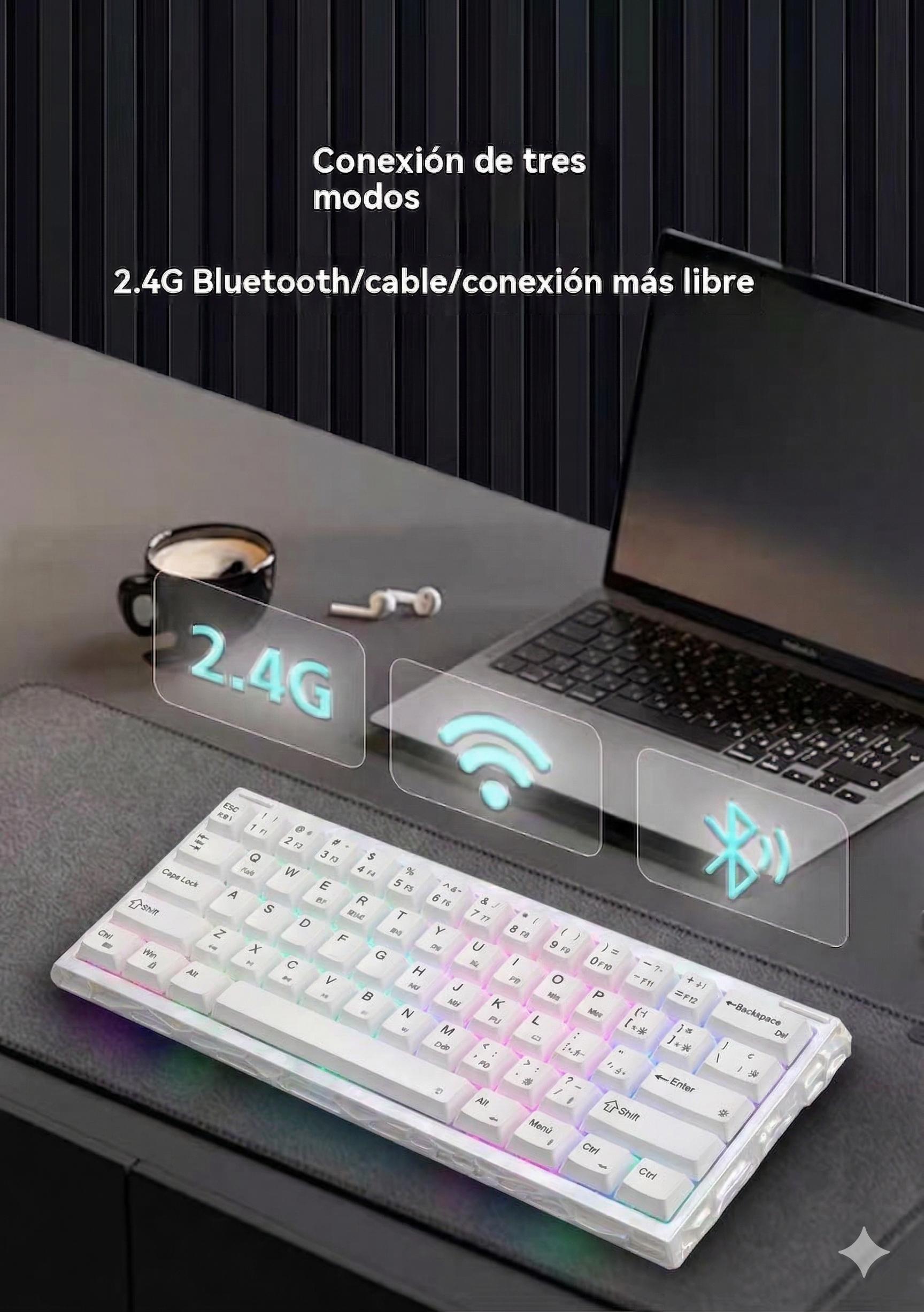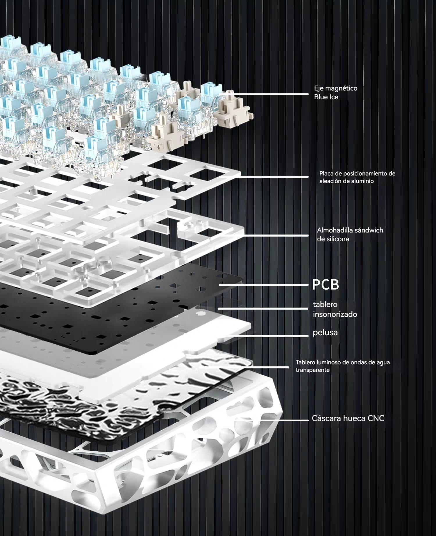 Teclado Magnético Mecánico 8k Rgb E-sport;Disposicion de 61 teclas;Eje azul hielo Outemu;Tasa de retorno 8K;Tasa de muestreo de escaneo 128K;Precision RT0.005mm;Tasa deescaneo detecla completa 16K;Tiempo de retardo 0.1ms;Tres modos-Bluetooth/2.4/Con cable